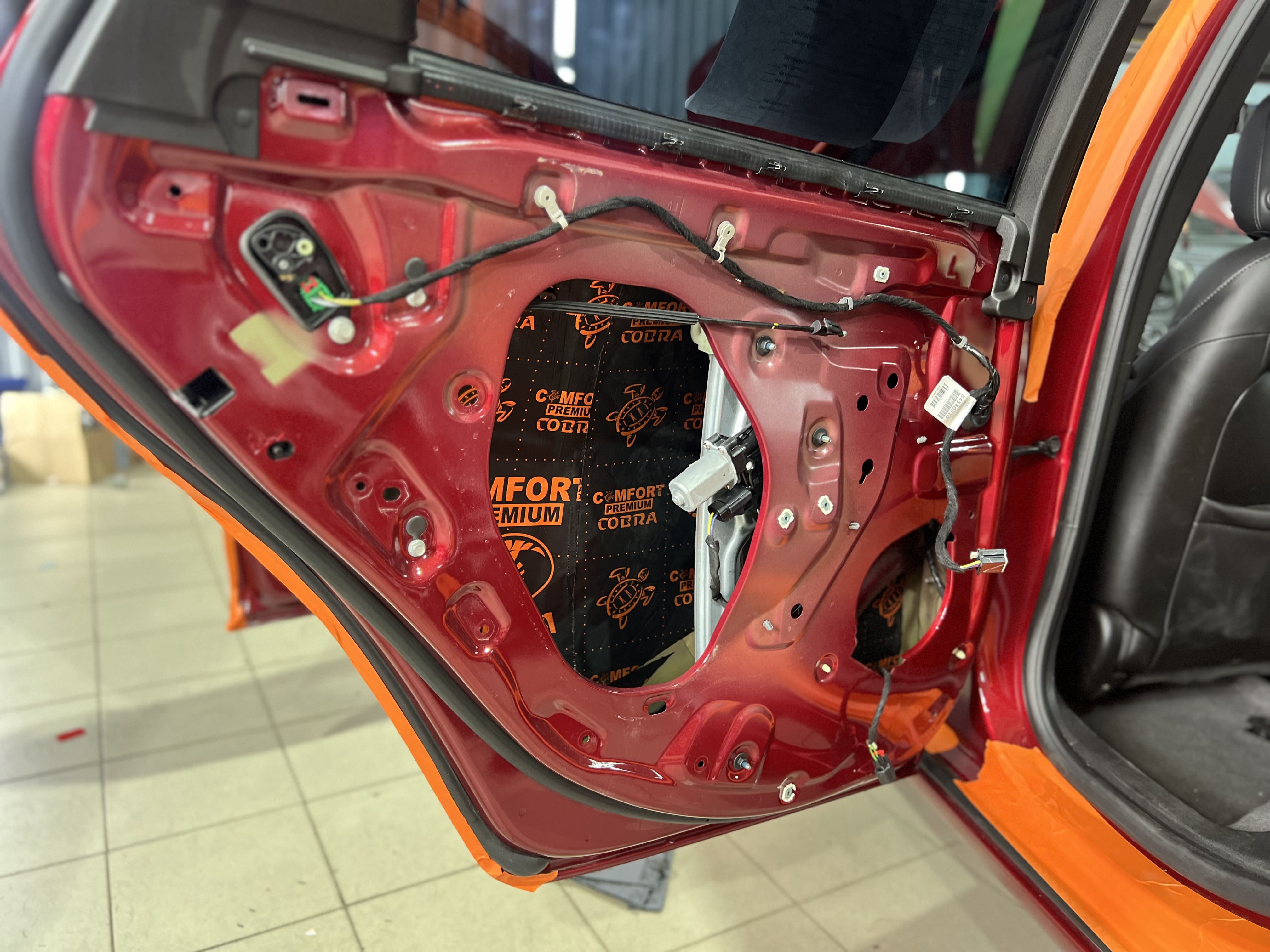 Первым слоем на двери и дверь багажника нанесли виброизоляцию Comfort Mat Dark Cobra.