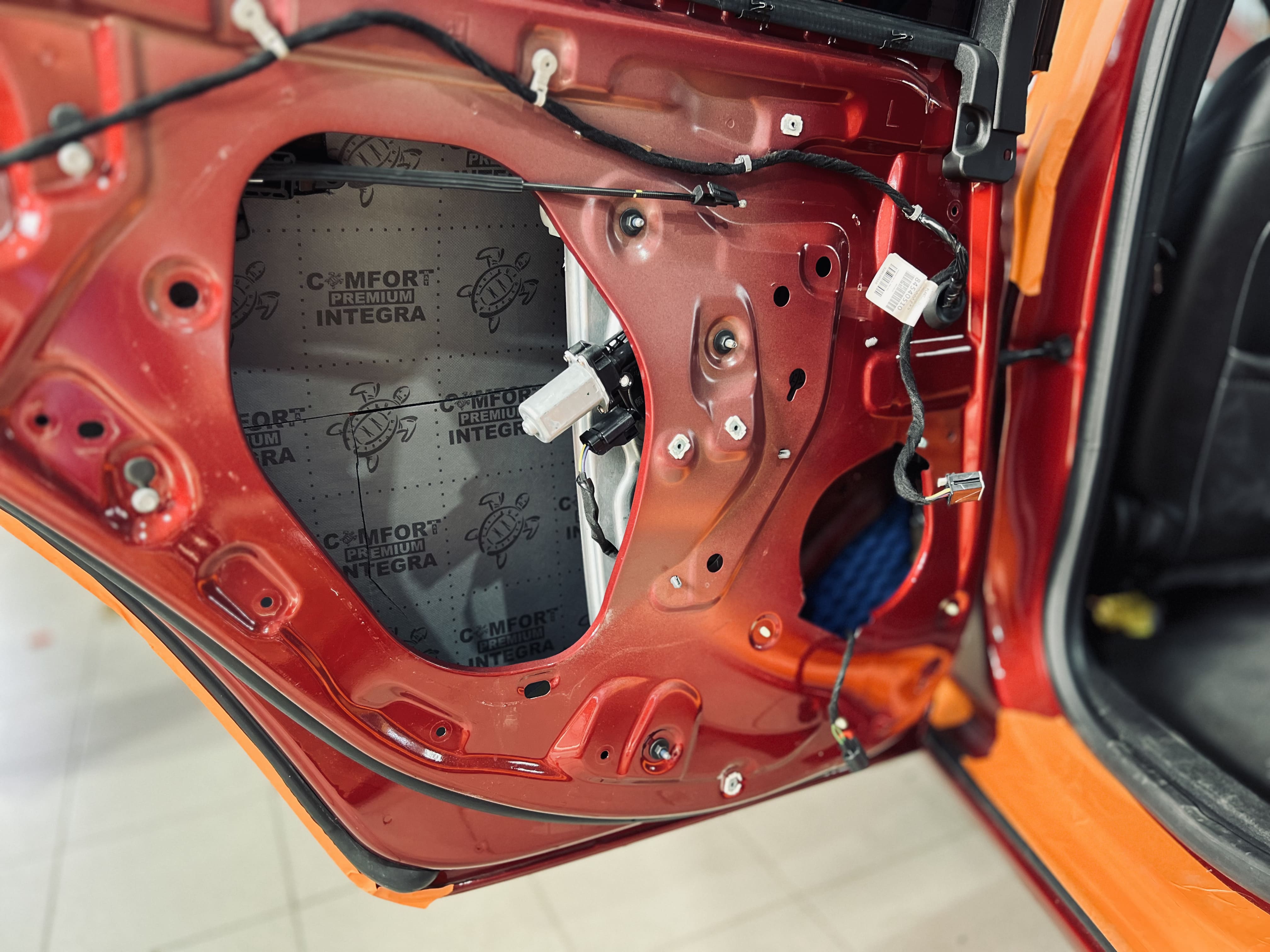 Вторым слоем на двери уложили шумоизоляцию Comfort Mat Integra, поглощающую внешние шумы и добавляющую теплоизоляцию. На фото показана дверь с готовым слоем Integra, создающим надежное покрытие.