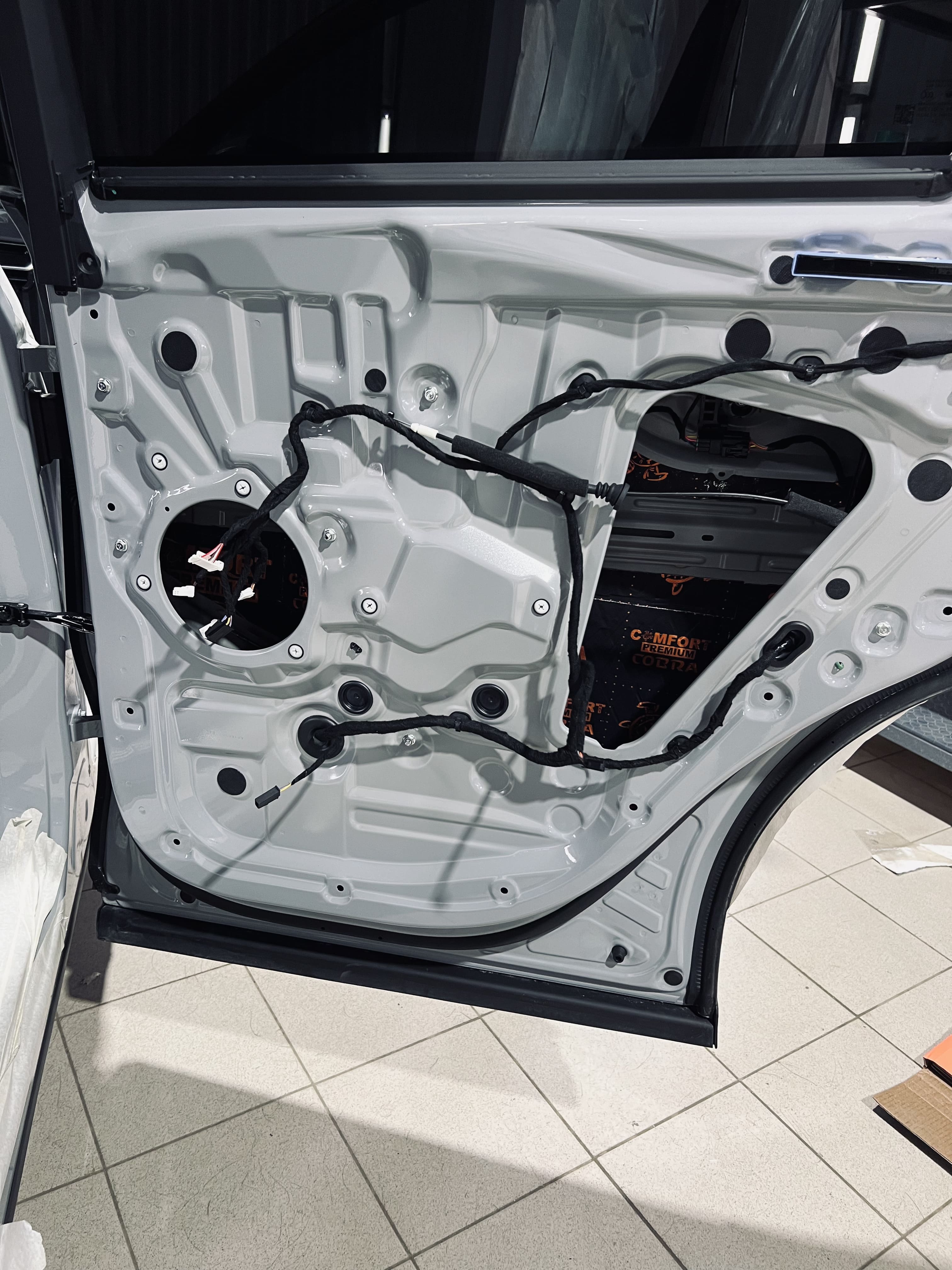 Первым слоем на двери и дверь багажника нанесли виброизоляцию Comfort Mat Dark Cobra. Инновационный шумоизолирующий материал толщиной 2,3 мм, относится к премиальной серии.