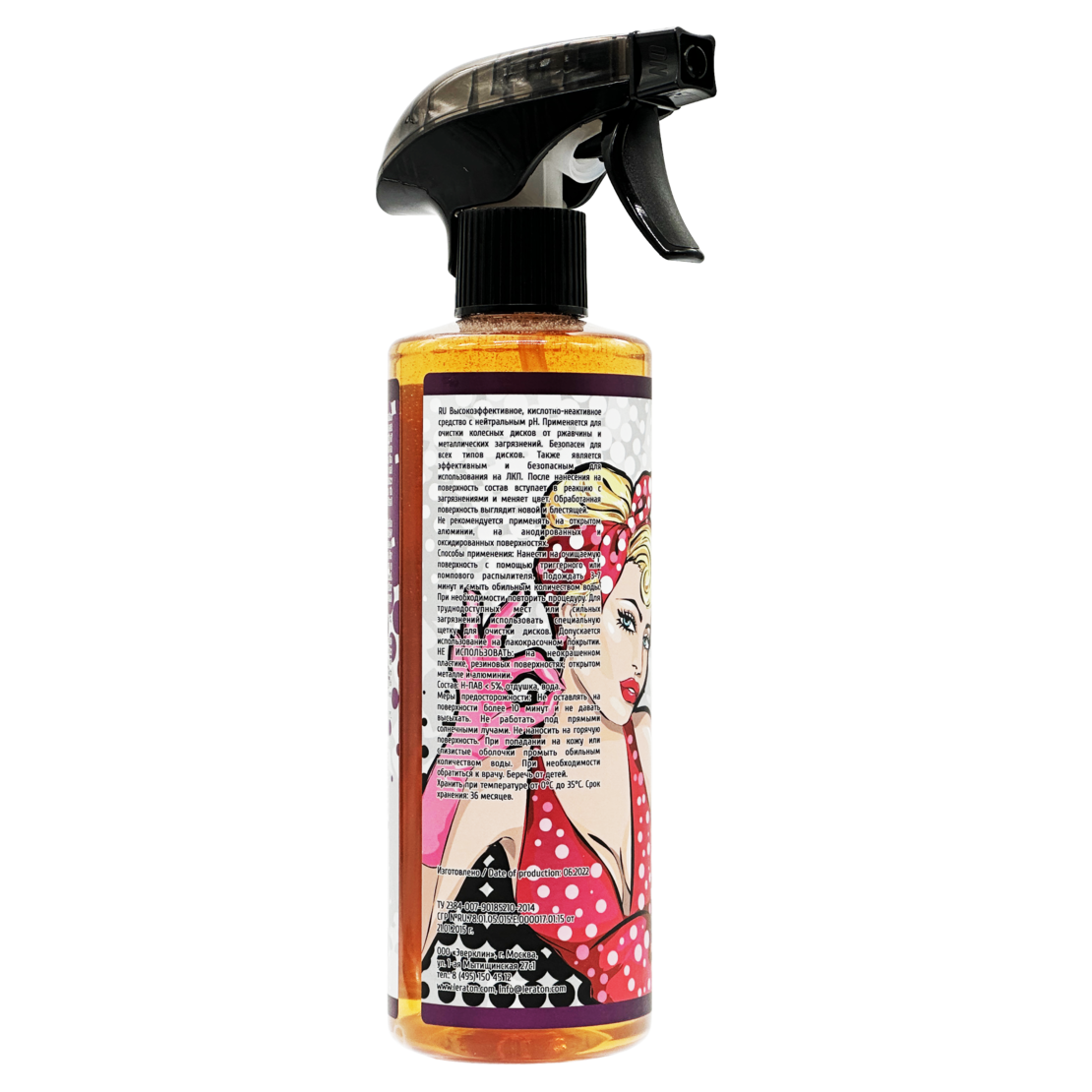Очиститель автомобильных дисков с нейтральным pH. Эффективно борется со следами коррозии и металлическими вкраплениями. Может наноситься на любые поверхности, в том числе из анодированных сплавов, хрома, алюминия. Имеет свойство изменять оттенок при нанесении на поверхность. Обработанные диски приобретают эстетичный блестящий внешний вид. Может применяться для грузовых, легковых авто и мототехники. Наносится методом распыления, не нуждается во втирании.